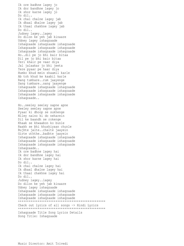 Lyrics Hungama Com Ishaqzaade Songs Lyrics - Ishaqzaade is title song of the movie.